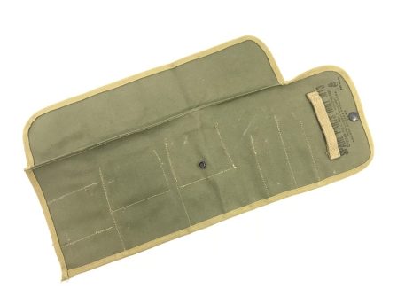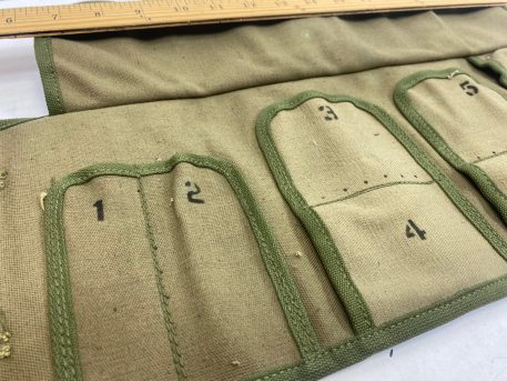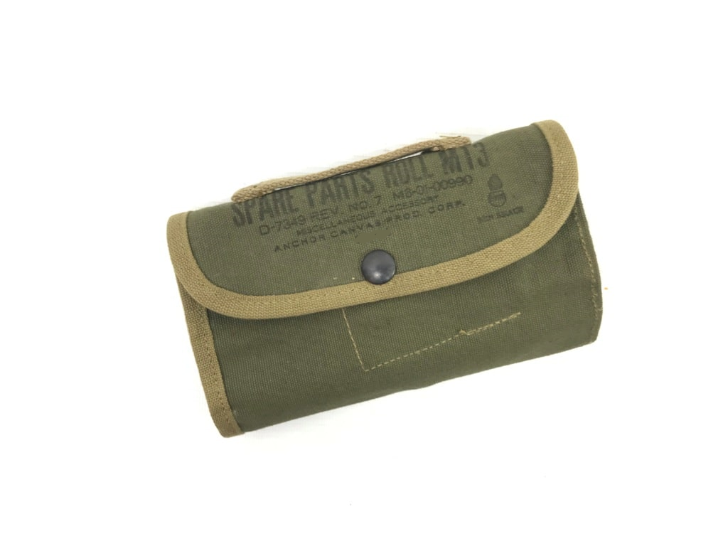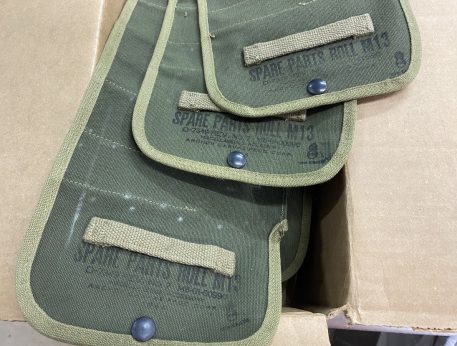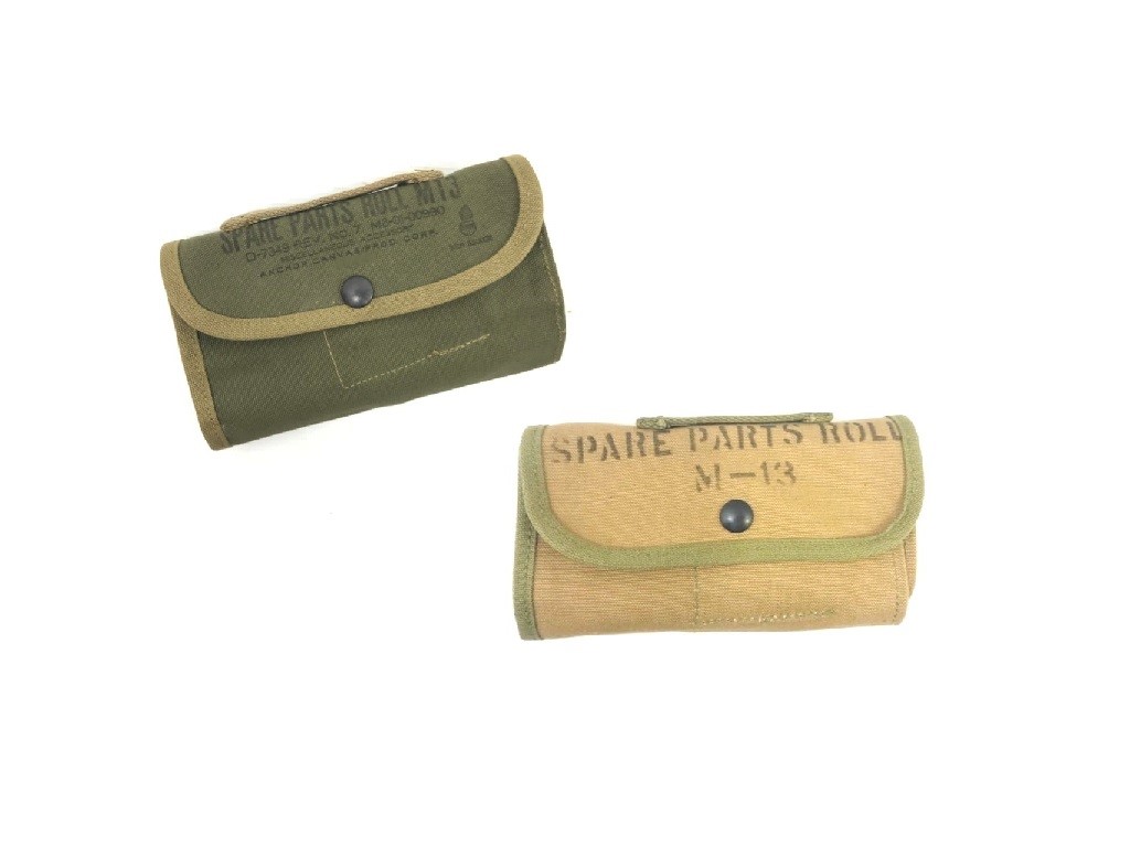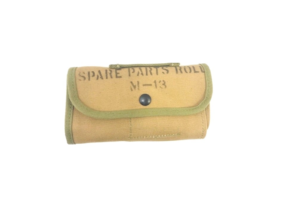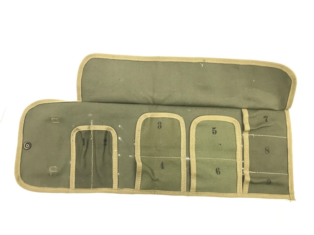 Cotton canvas spare parts roll, Two types-WW2 khaki with OD trim and Olive Drab khaki trim. M13, WW2 9 slot. Snap feature for roll up. 7x4x1 roll up