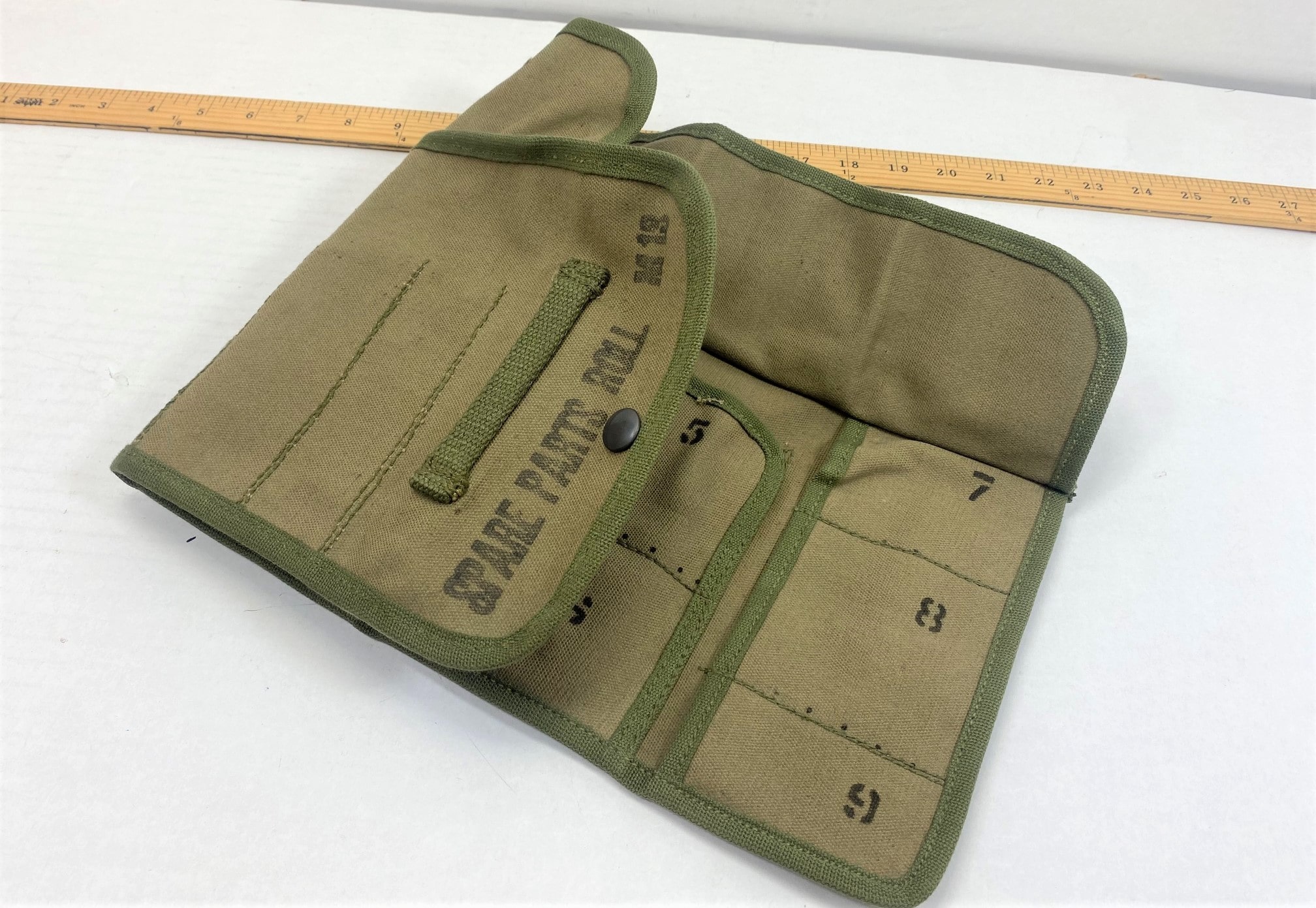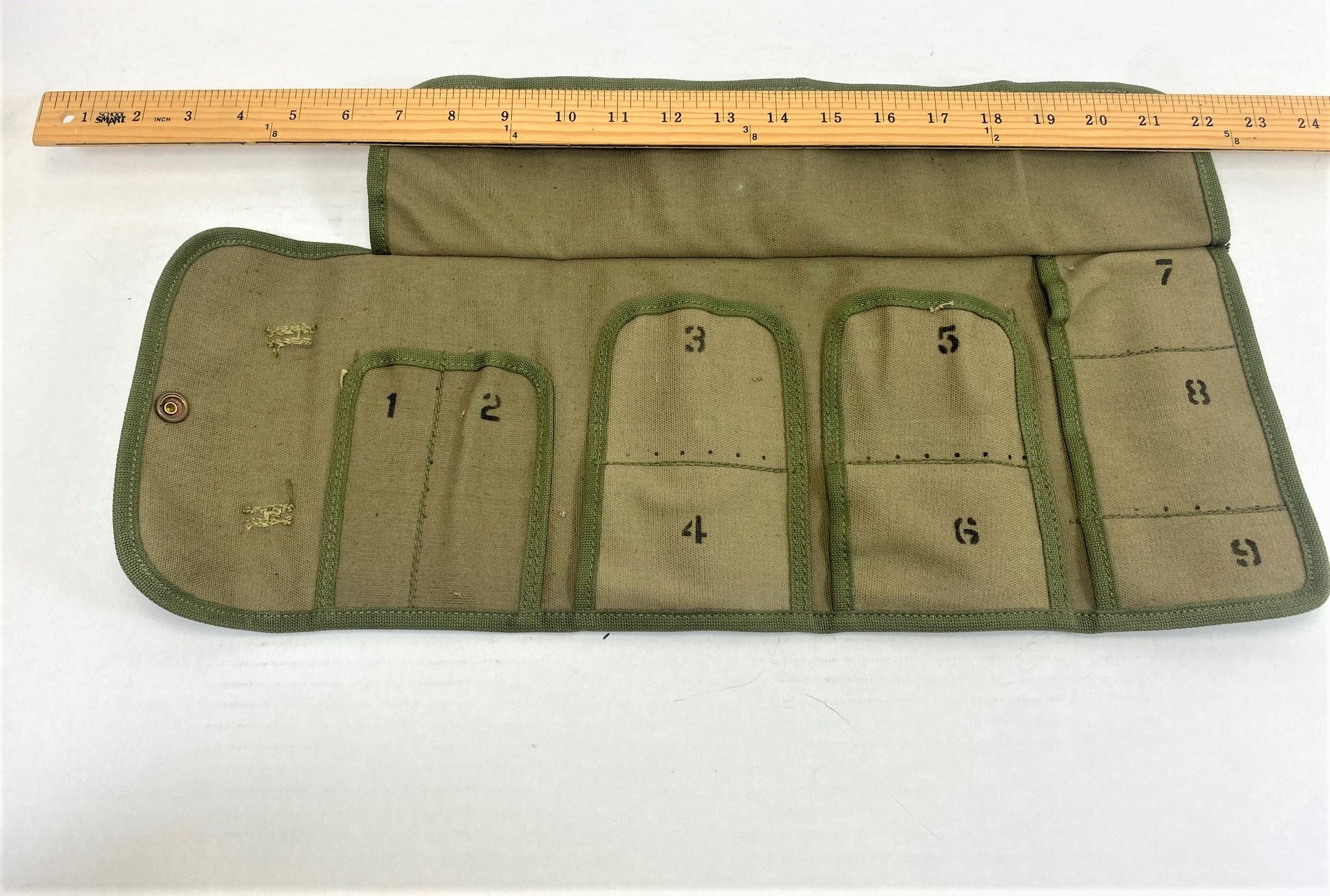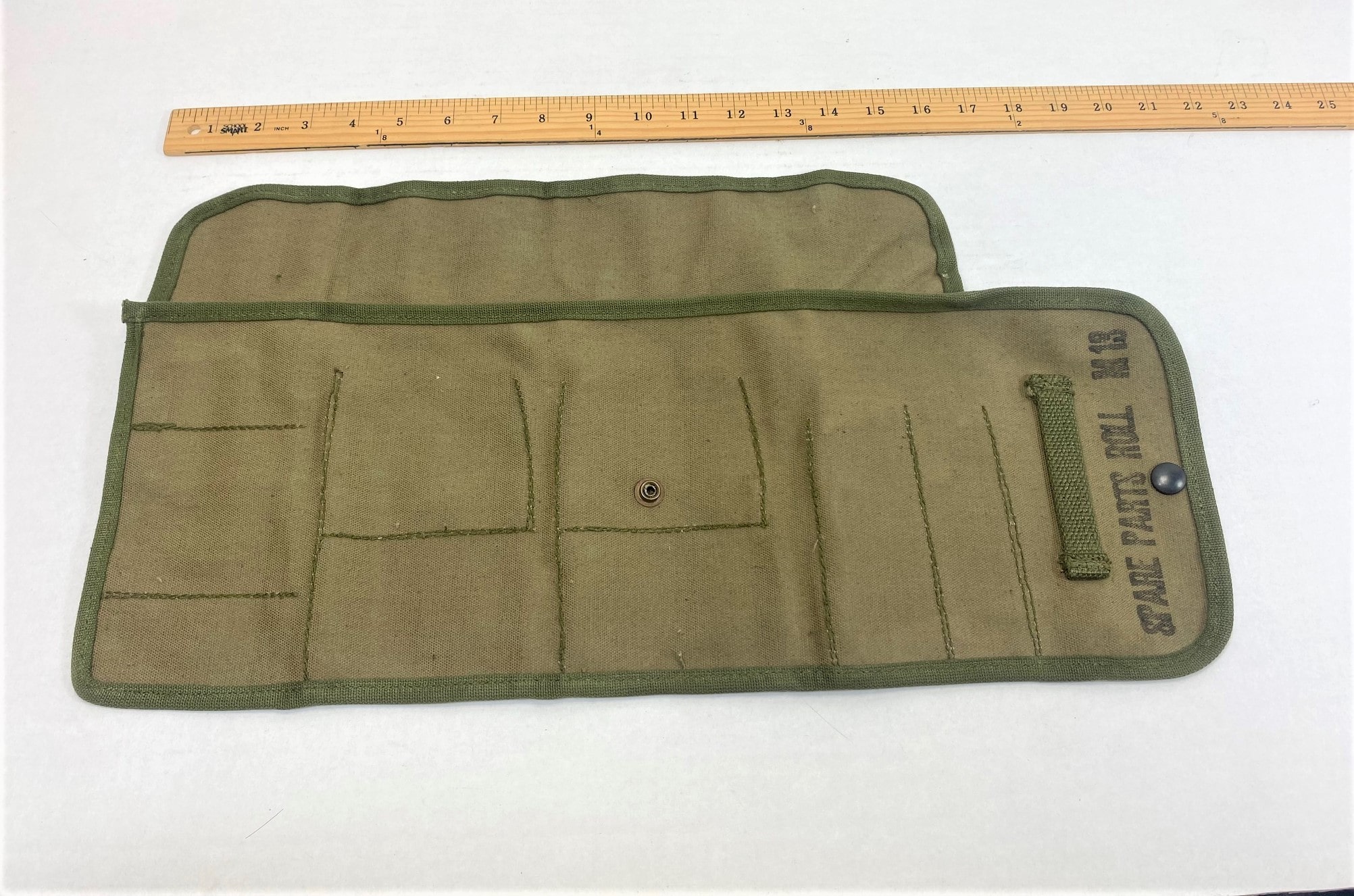 Cotton canvas spare parts roll, Two types-WW2 khaki with OD trim and Olive Drab khaki trim. M13, WW2 9 slot. Snap feature for roll up. 7x4x1 roll up