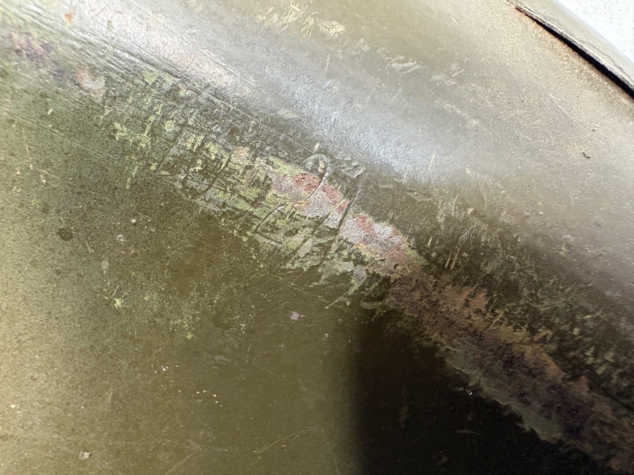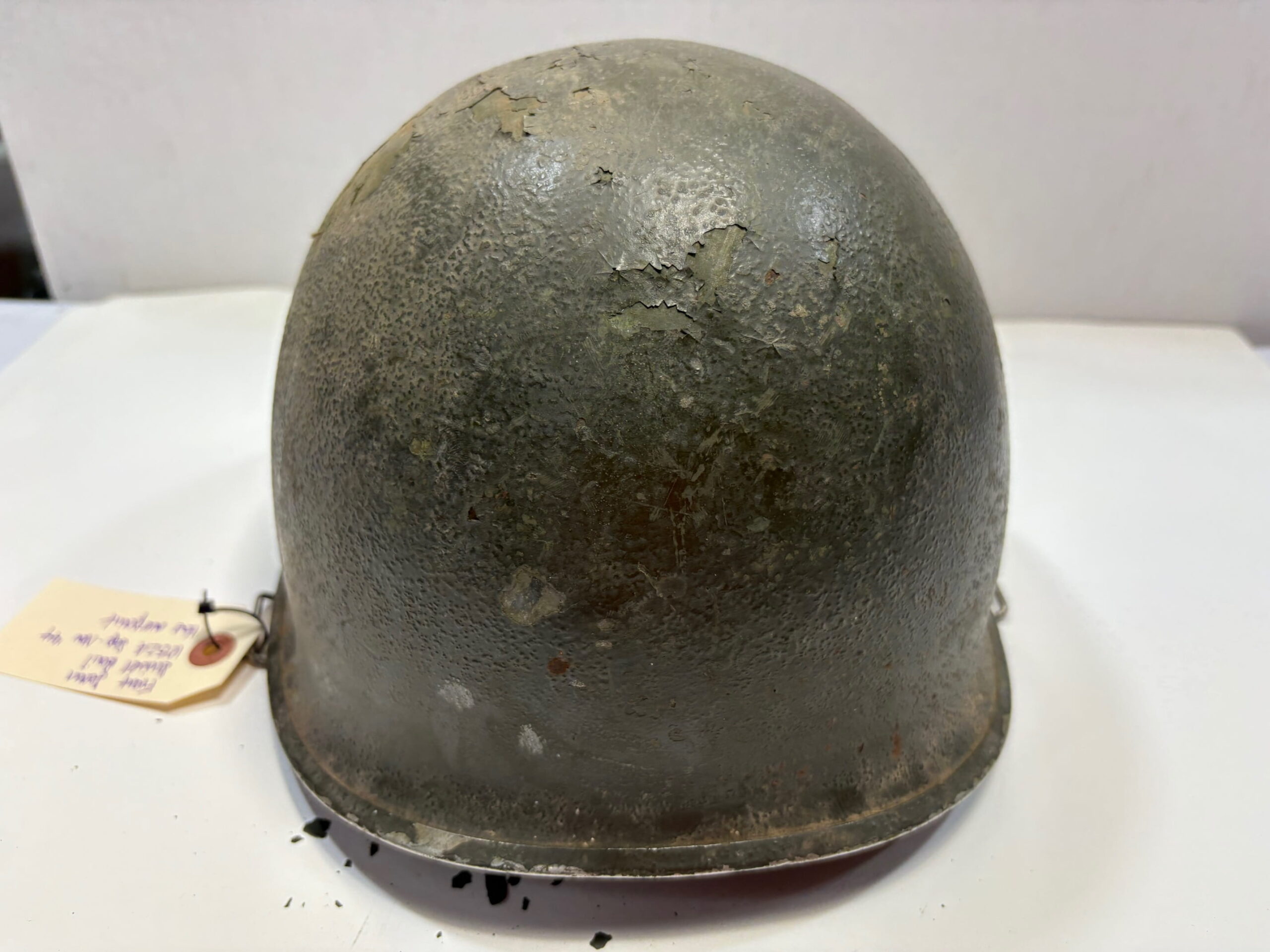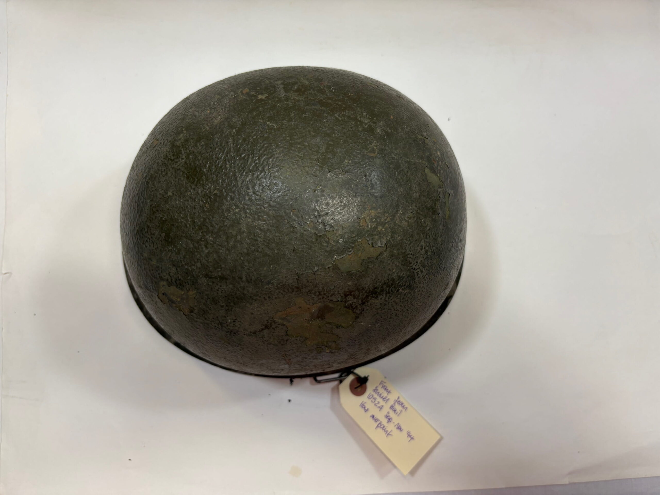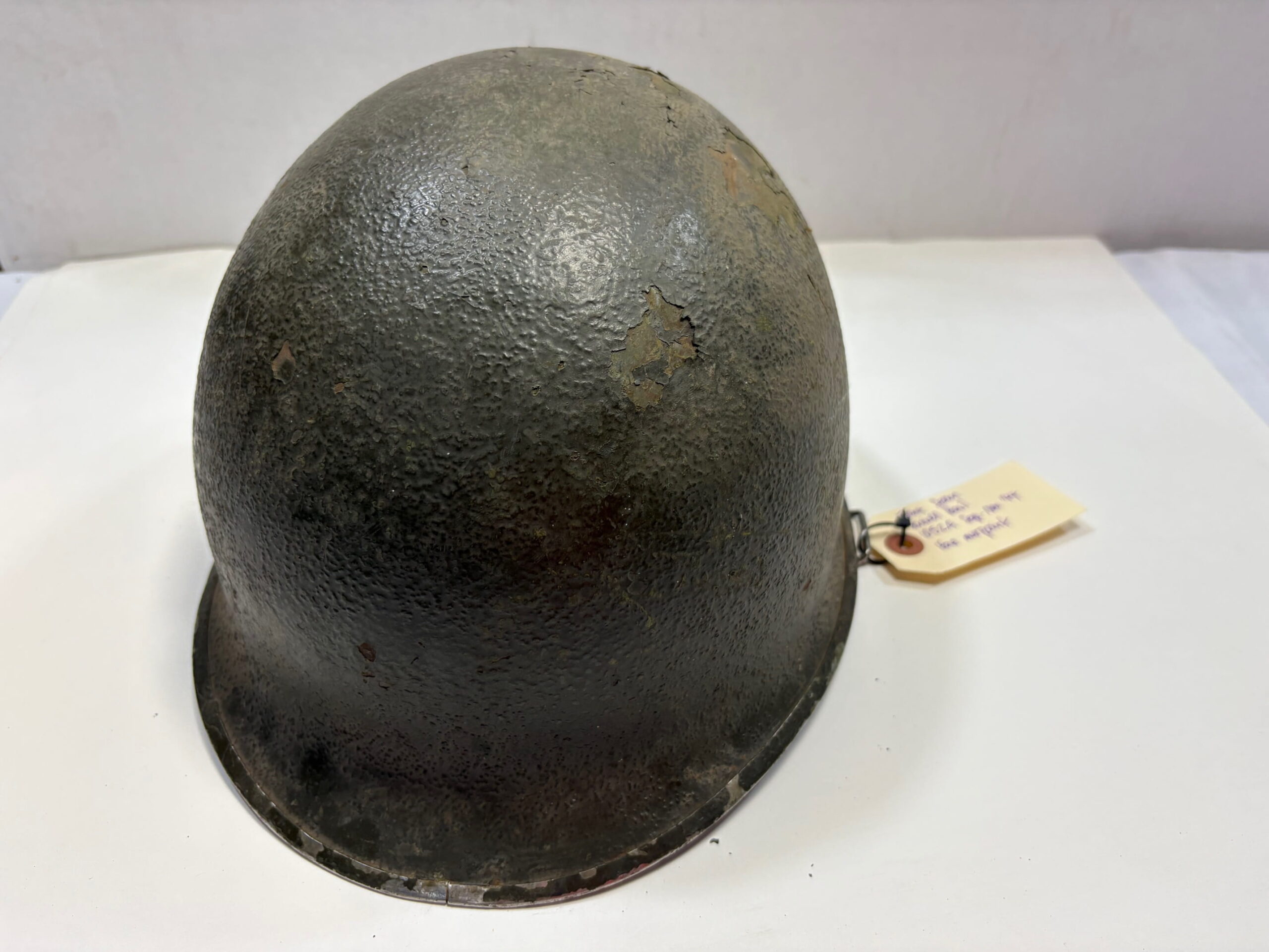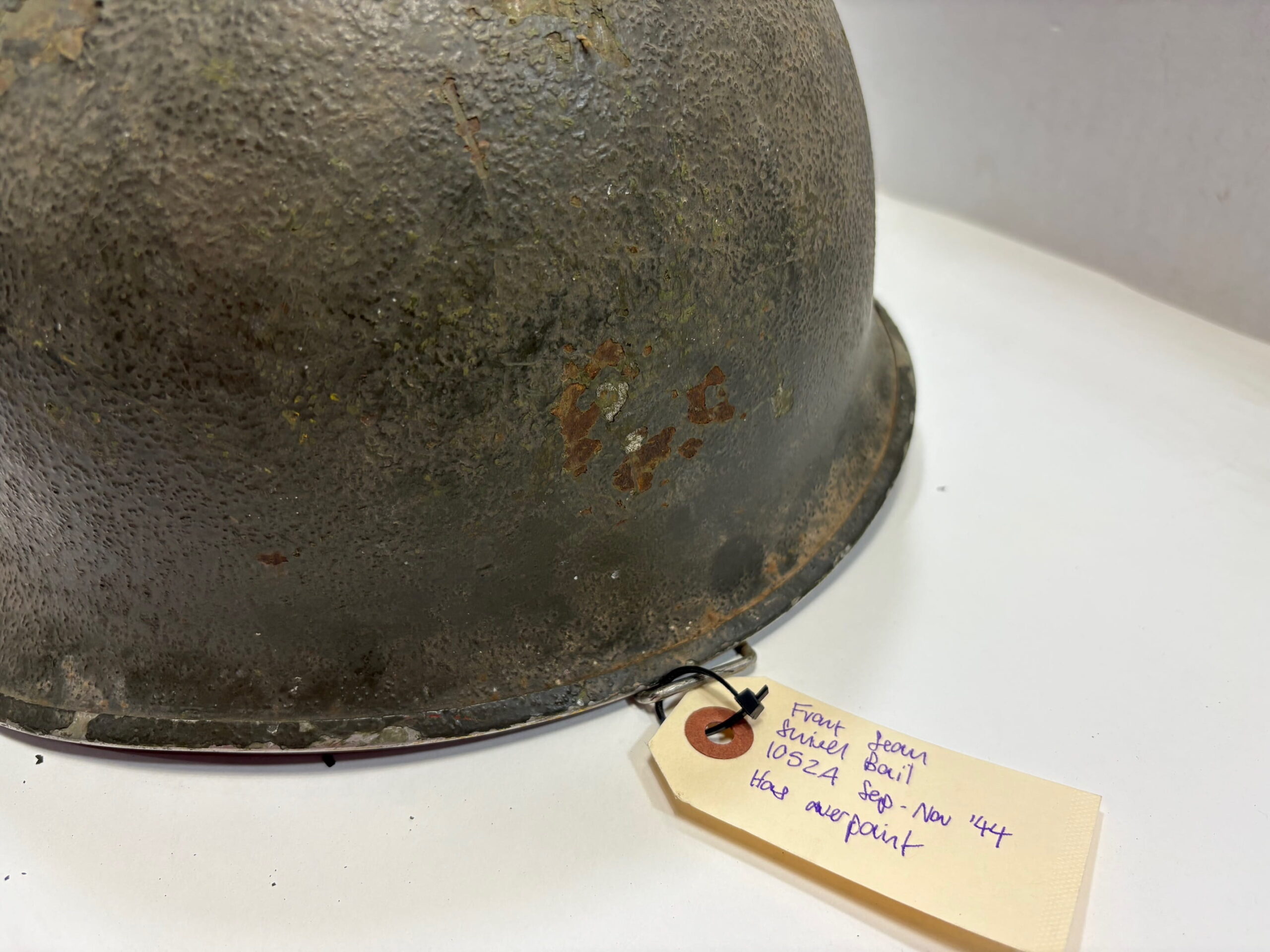 Genuine front seam swivel bail WW2 Steel Pot Helmet, 1052A. September – November 1944. Overpaint pot with heat stamp. 1 only, sold as is. No Returns.