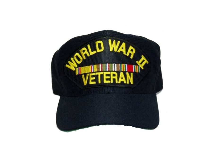 Ship’s cap style ball cap manufactured in US by Eagle Crest. Adjustable to fit most sizes. Solid poly material with patch front emblem. World War 2 Veteran cap with ribbons from European Theater.