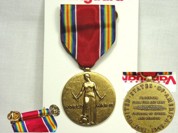 World War II victory medal. Full size. This medal was awarded to all Service personnel who served at least one day of active duty any time between 7 Dec 1941, and 31 Dec 1946. The mutil-colored edges of the ribbon are miniature versions of the WW1 victory medal.